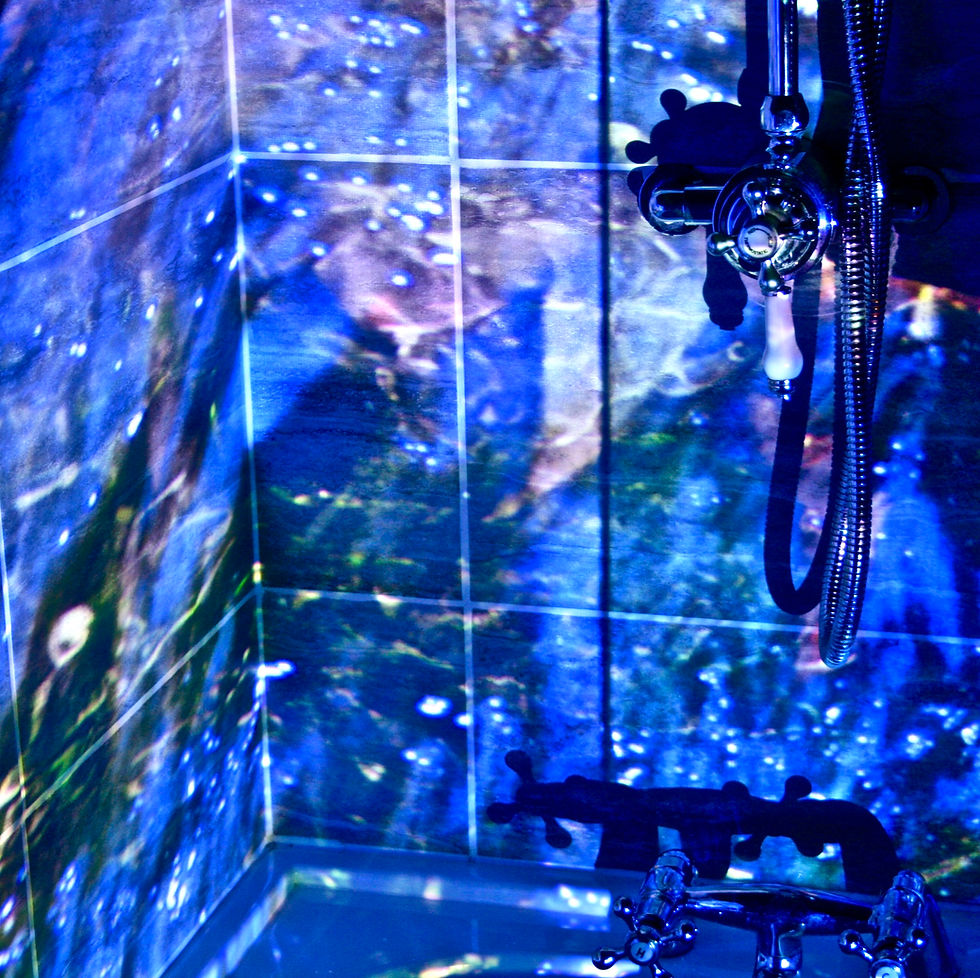 I am trying to achieve the full immersion in my images, keeping the sound element. It seems that the sound of the shower is the easiest to use when trying to replicate the sound of the rain. Using some of my images projected onto the tiles, a contrast was created by the shower hose and dial. The metallic shapes and the shadows they made added lots of interesting shapes and textures.